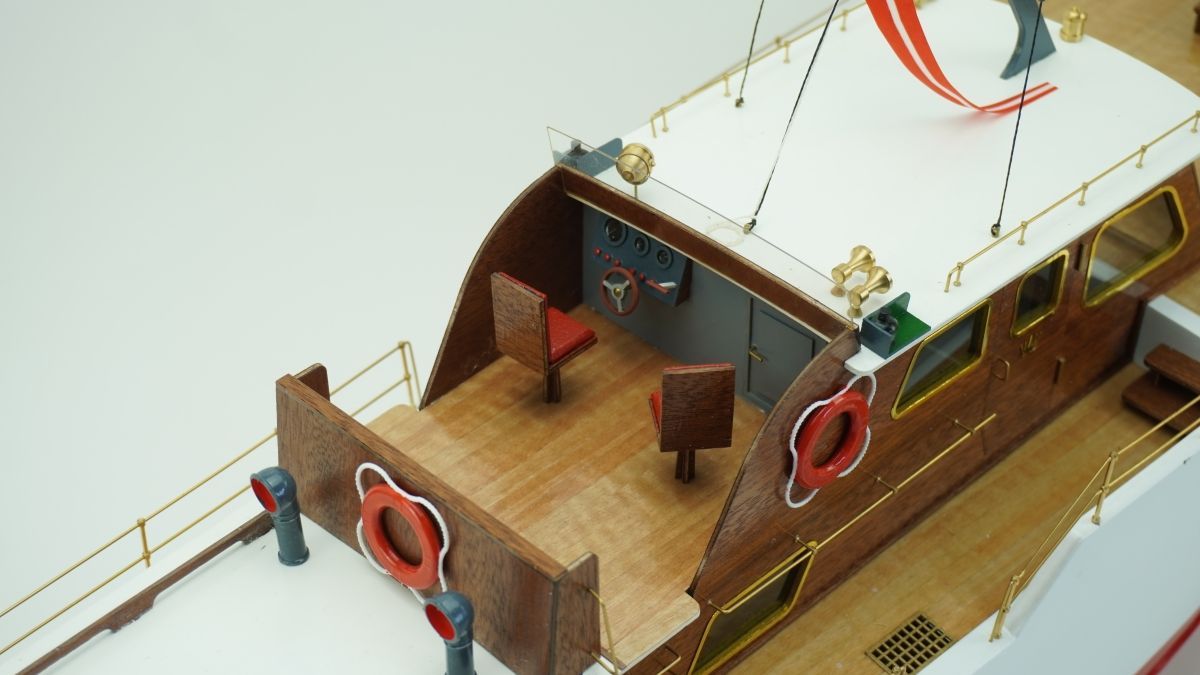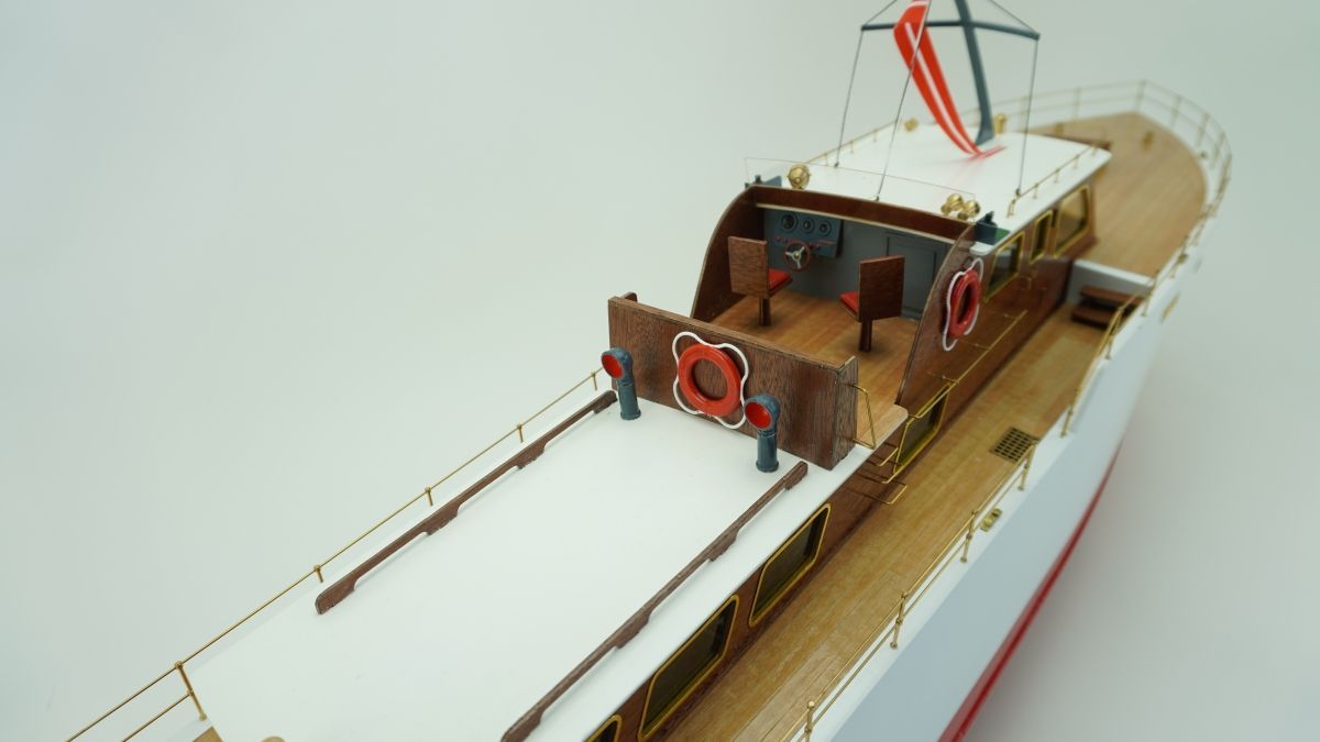 Maketa luxusní motorové jachty z padesátých či šedesátých let dvacátého století. Lodi tohoto typu sloužily pro zábavu/přepravu movitých majitelů, hollywoodských hvězd a jiné smetánky. Tomu také odpovídalo hojné použití mahagonu a teaku v konstrukci lodi, chromovaných kovových částí, luxusně polstrovaných kožených sedaček a jiného nóbl příslušenství.