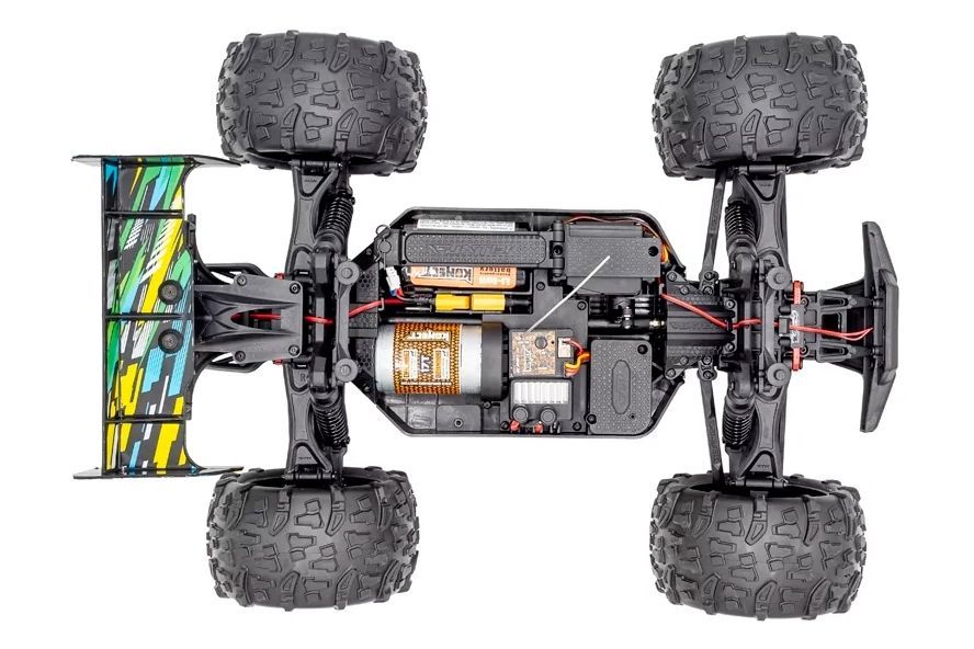RTR truggy v měřítku 1:12 poháněná stejnosměrným motorem velikosti 540 s 2,4GHz RC soupravou Konect, včetně Li-Ion pohonného akumulátoru a USB nabíječe.