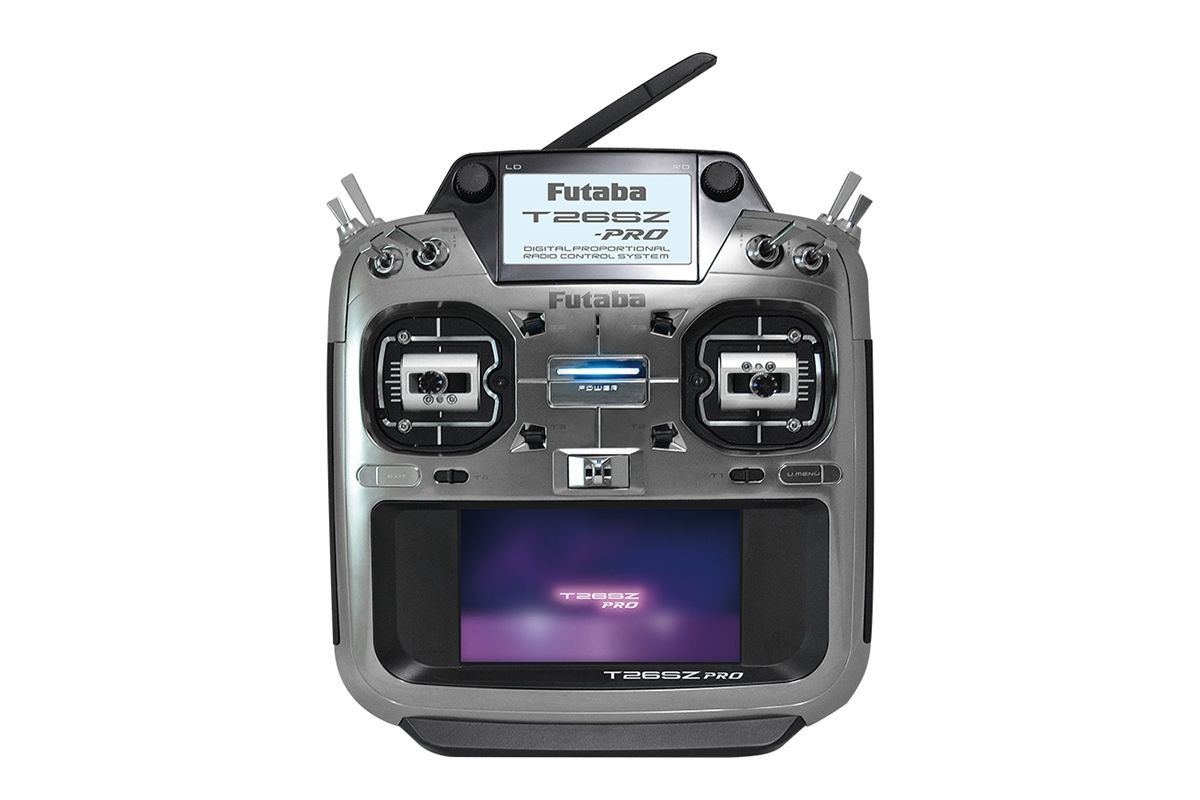 Vysílač T26SZ PRO ve skříňce dokonale padnoucí do ruky je vybaven přesnými celokovovými křížovými ovladači s nastavitelnou aretací/neutralizací, úhlem sklonu páky a mechanicky nasatvitelným rozsahem pohybu nahoru/dolů i vlevo/vpravo. Místo obvyklých potenciometrů jsou osazeny magnetické enkodéry zajišťující vysokou životnost a stálost parametrů. T26SZ diaponuje 8 přepínači, 4 posuvnými ovladači, 6 digitálními trimy a 2 otočnými proporcionálními ovladači. K programování slouží dvojice tlačítek a velký podsvícený barevný dotykový LCD displej zajišťující snadnou orientaci v intuitivním menu. vybrané údaje teůemetrie nebo časomíry je možno zobrazovat na pomocném LCD displeji na horní straně vysílače. T26SZ PRO má paměť pro 30 modelů neomezeně rozšiřitelnou pomocí mikroSD karty a širokou škálu pokročilých mixových funkcí pro akrobatická letadla, větroně, vrtulníky a multikoptéry. Kromě zobrazení telemetrických dat na displeji je k dispozici hlasový výstup telemetrie v zásuvce pro sluchátko (není součástí soupravy). T26SZ PRO je rovněž vybaven zásuvkou učitel-žák a zásuvkou pro programování a nastavování S.BUS serv a gyroskopických systémů CGY770/CGY755/CGY760R nebo GYA553/573. USB nabíjecí/datová zásuvka na horní straně vysílače možňuje používat T26SZ PRO po připojení k PC USB kabelem jako ovladač pro RC simulátor bez potřeby dodatečného USB rozhraní.