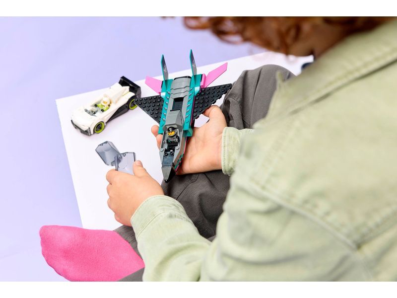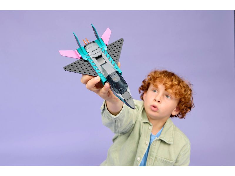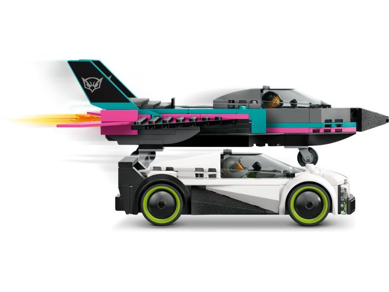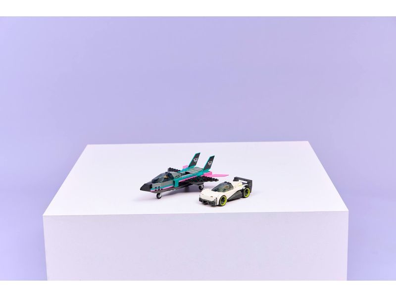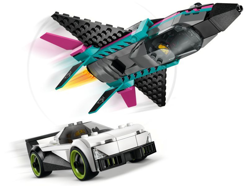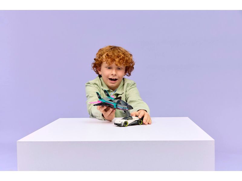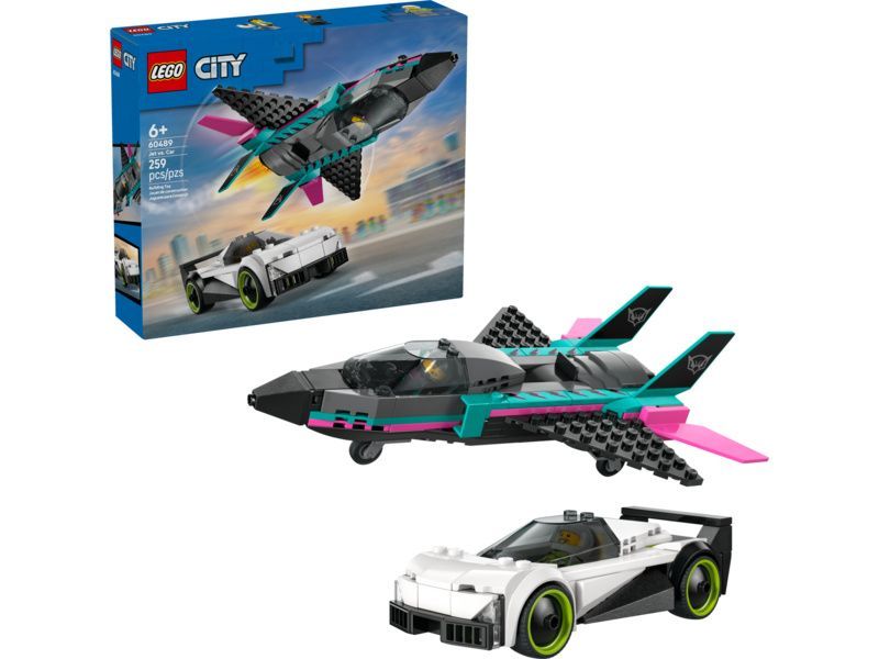 Dvojitá stavebnice LEGO® City Tryskáč vs. auto (60489) obsahuje elegantní supersportovní auto a nadzvukové letadlo, se kterými si malí stavitelé užijí hodiny závodění. Model tryskáče má křídla se šípovitým profilem, dvojitá vertikální křidélka a stabilizátory. Děti můžou zapnout přídavné spalování tryskáče posunutím páčky a otevřít kokpit supersportovního auta, aby si prohlédly propracovaný interiér se závodním sedadlem. Usaďte minifigurky pilota a závodního řidiče a odstartujte strhující závody.