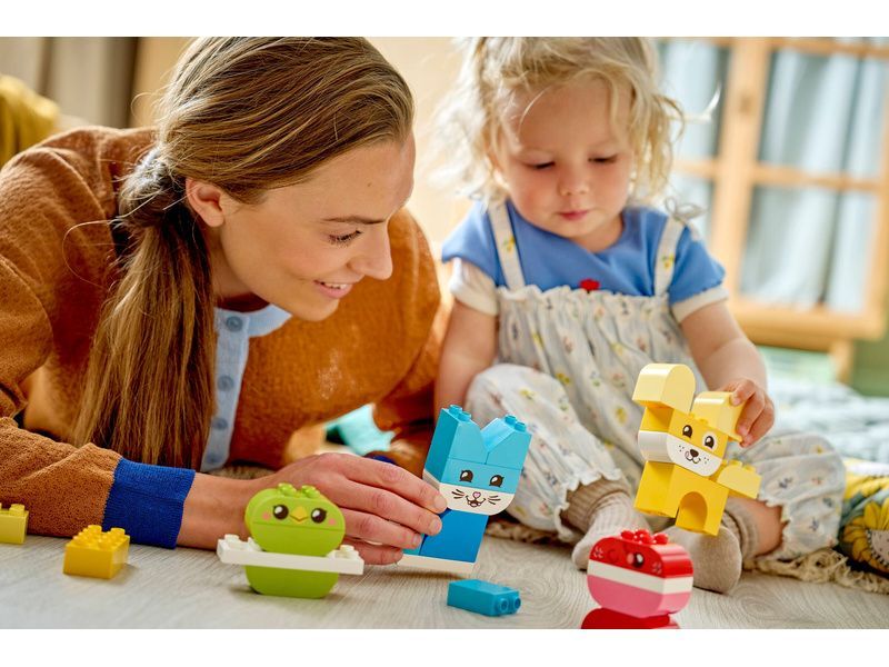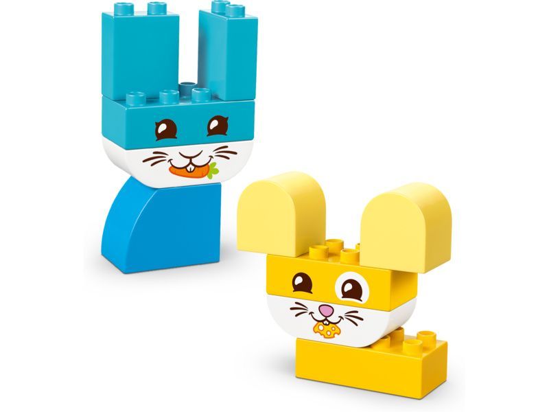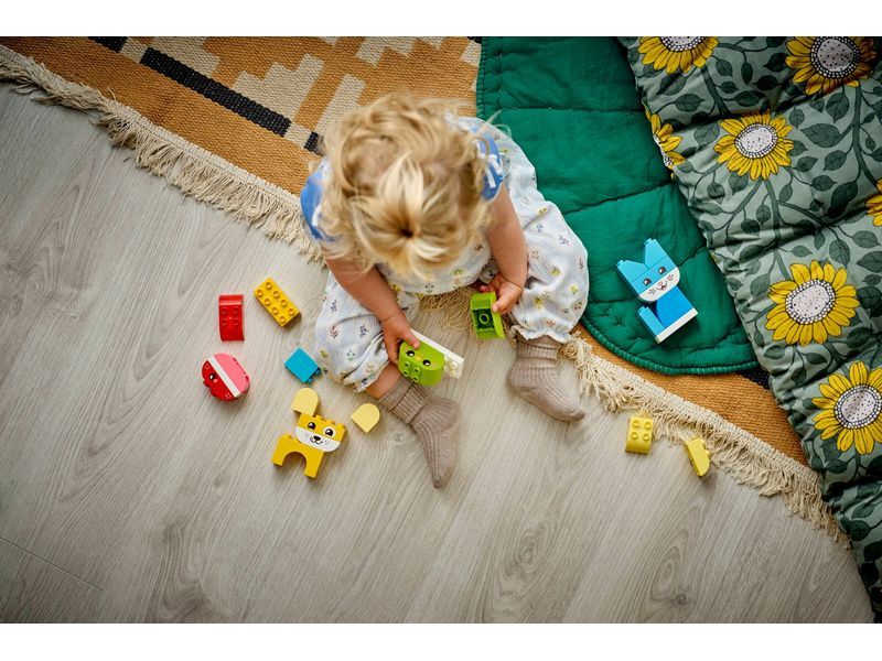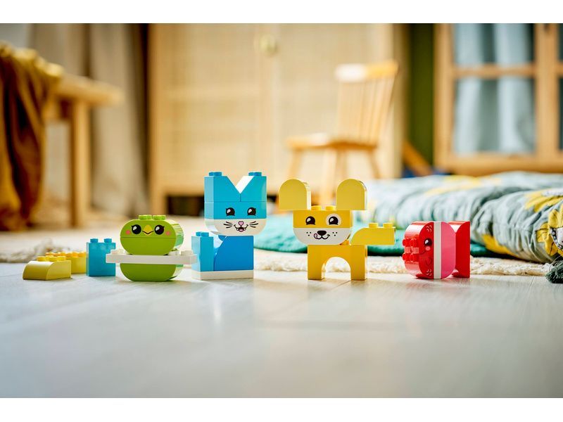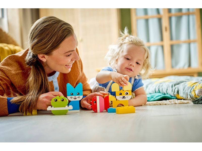 Některé z těchto modelů zvířátek pro malé děti jsou sestavené z kostek LEGO DUPLO jedné barvy. Malí stavitelé si tak můžou procvičit třídění barev a vytvořit mazlíčka, kterého dokončí přidáním kostky s tváří zvířecího kamaráda.