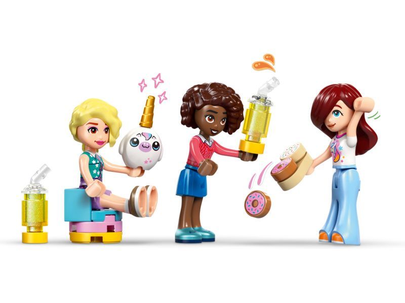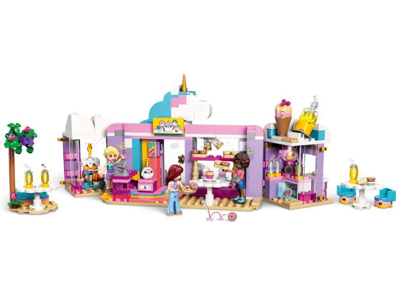 Propracovaná stavebnice obsahuje 3 minipanenky, hračky v podobě dortů, donutů, vaflí a sušenek, a děti si s ní užijí hodiny hraní bez konce. Nechybí ani roztomilé cupcaky, které můžete vystavit ve výloze nebo na otočném podstavci. A to není vše. Bar s džusy a mléčnými koktejly, vnitřní a venkovní posezení, pokladna a plyšová hračka v podobě jednorožce LEGO nabízí spoustu dalších možností na vymýšlení příběhů. Malí fanoušci stavebnic Friends si užijí kreativní hru s majitelkou kavárny Izou a zákaznicemi Paisley aAliyou.