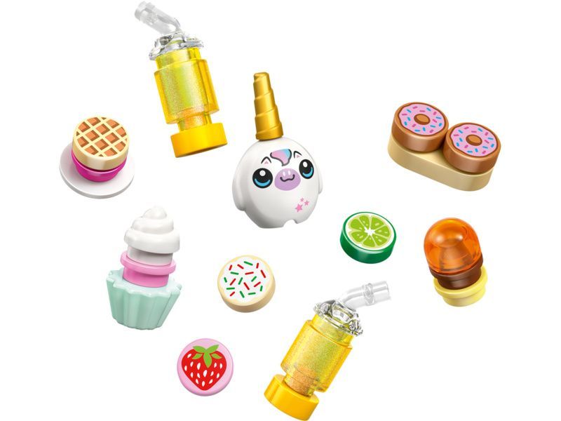 - PROPRACOVANÉ DOPLŇKY KAVÁRNY Oživte hru pomocí hraček v podobě donutů, vaflí, sušenek, cupcaků, dortů, baru s džusy a mléčnými koktejly, posezení, pokladny a plyšovým jednorožcem LEGO®