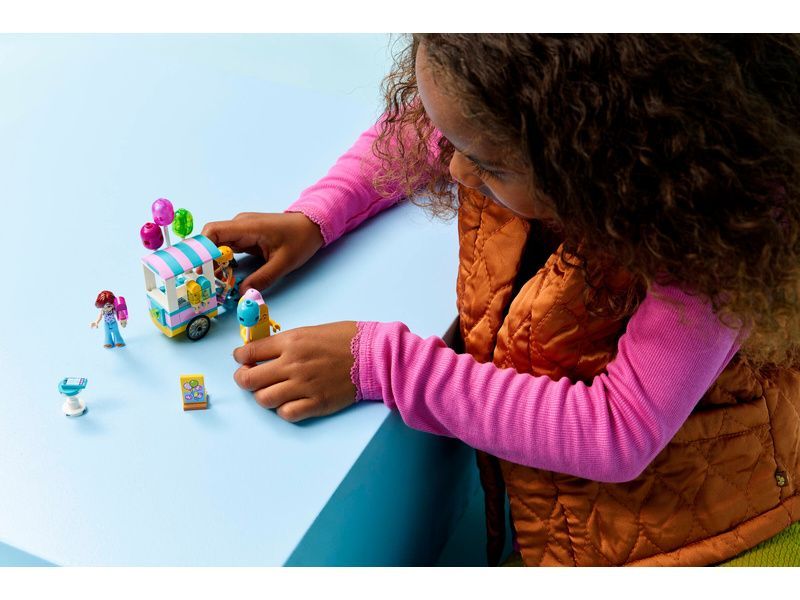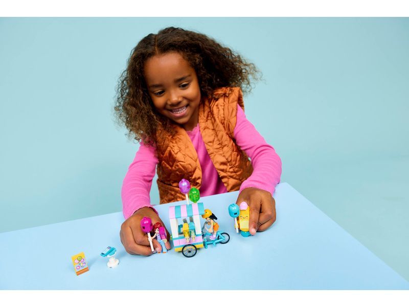 Holky a kluci od 6 let si užijí sladká dobrodružství a kreativní hraní se stavebnicí LEGO® Friends Stánek se zmrzlinou a balónky (42692). Tato hračka je plná zábavných detailů a roztomilých doplňků, které podněcují dětskou představivost. Díky minipanenkám Liann a Paisley a přípravě stánku na prodej balonků a nanuků se děti mohou skutečně vžít do příběhu. Liann má helmu, aby mohla jezdit na kole se stánkem. Děti si můžou hrát i s maskotem v podobě nanuku, jídelním lístkem, pokladnou a telefonem. Nechybí stolek, u kterého se kamarádi scházejí.