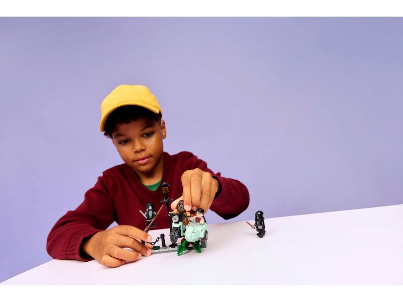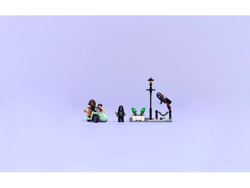 Součástí je první model LEGO Hagridovy létající motorky v měřítku minifigurek, 4 minifigurky LEGO Harry Potter a miniaturní scénu Zobí ulice, která inspiruje ke kreativnímu hraní. Usaďte minifigurku Rubeuse Hagrida na motorku a Harryho Pottera do postranního vozíku. Umístěte 2 minifigurky Smrtijedů do scény Zobí ulice, kde najdete také lampu a květináč, který lze během odvážného útěku hrdinů převrátit.