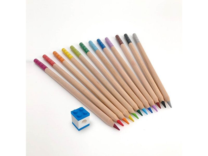 LEGO barevné pastelky, mix různých barev. Balení obsahuje 12 ks dřevěných pastelek a barevný klip ve tvaru LEGO destičky pro uchycení pastelky např. do LEGO pouzdra nebo na přicvaknutí oblíbené minifigurky jako doplňku.