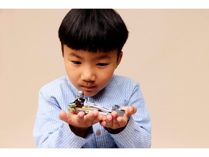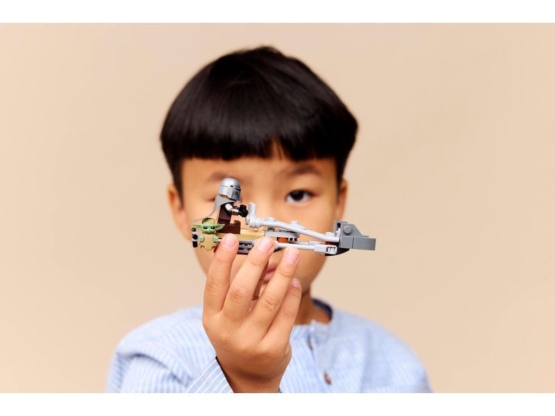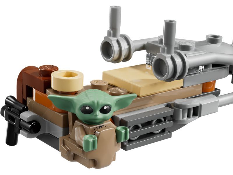 - SPÍDROVÁ MOTORKA Připevněte Mandalorianovu blasterovou pušku na zadní část spídrové motorky, posaďte ho na sedadlo řidiče a Grogua umístěte do brašny připevněné na boku