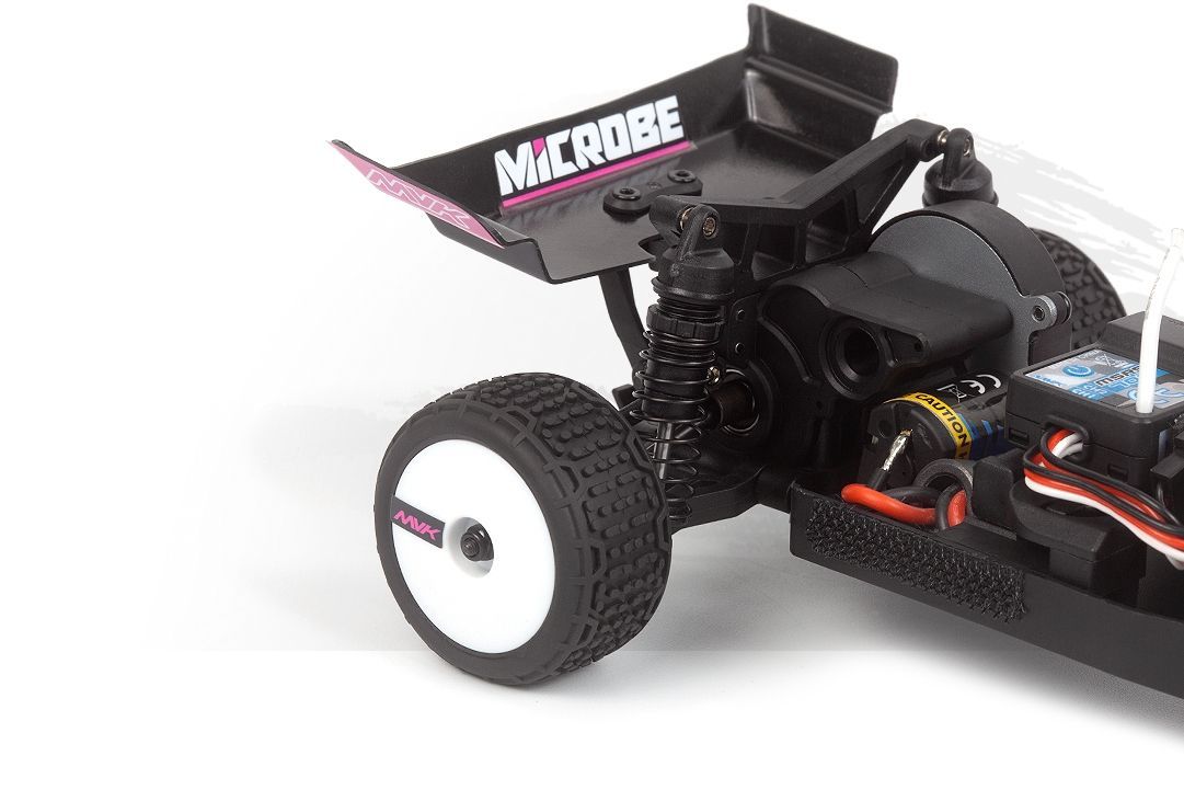 Elegantní 1,5 mm eloxované hliníkové plato podvozku, osazení kuličkovými ložisky a plynulá 3kolová zadní převodovka společně dodávají modelu Microbe stabilní a přesný pocit z jízdy. Přidejte olejové tlumiče a odvětrávaná kola s pěnovými vložkami a získáte malou buggy, která miluje zatáčky, pohlcuje nerovnosti a s jistotou vystřeluje ze zatáček.