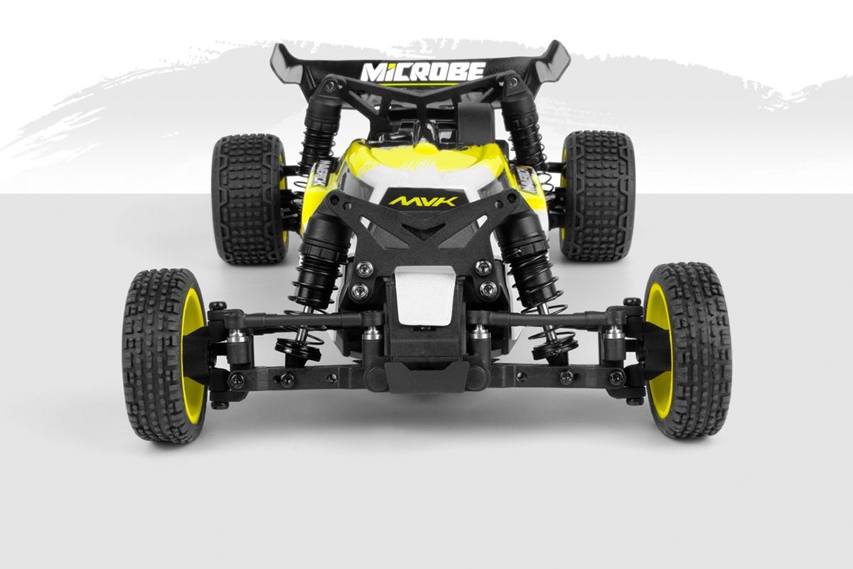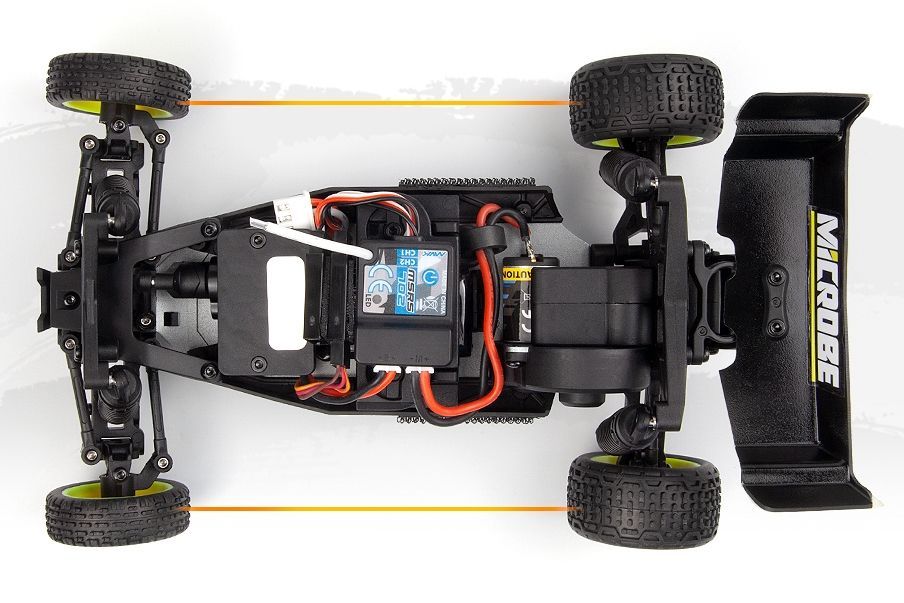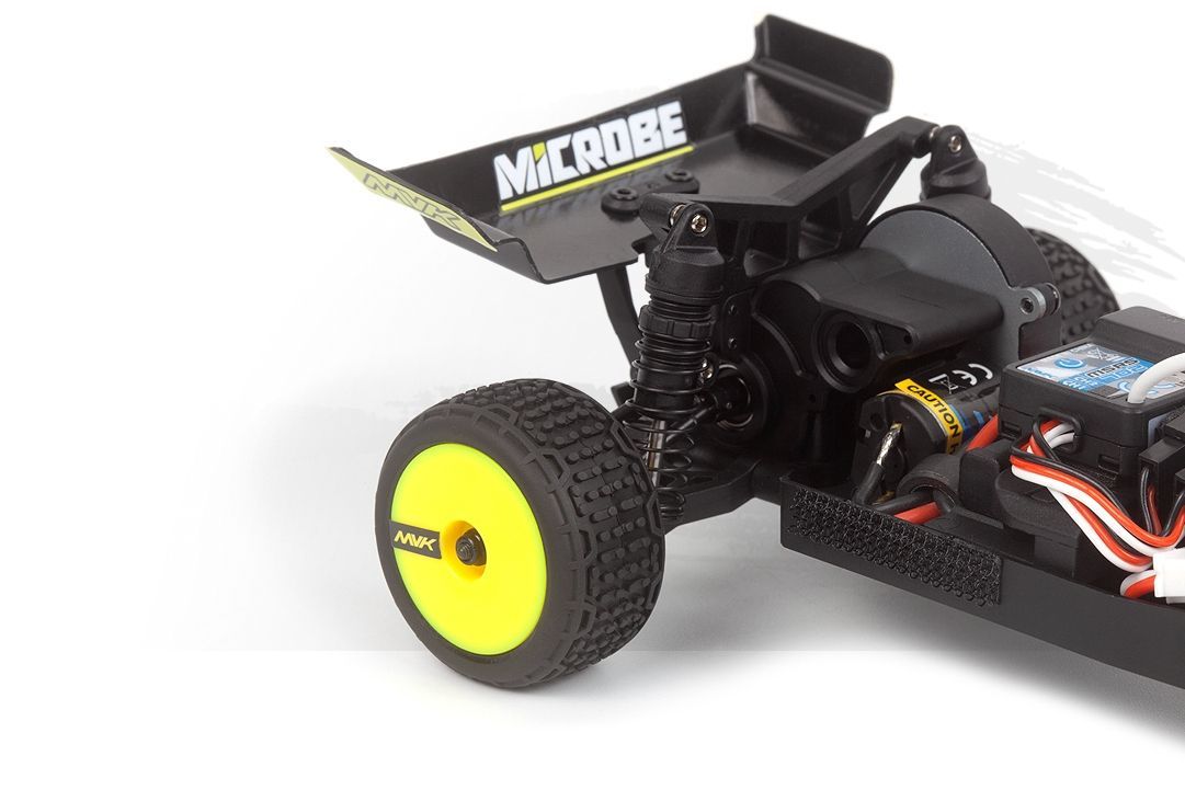 Elegantní 1,5 mm eloxované hliníkové plato podvozku, osazení kuličkovými ložisky a plynulá 3kolová zadní převodovka společně dodávají modelu Microbe stabilní a přesný pocit z jízdy. Přidejte olejové tlumiče a odvětrávaná kola s pěnovými vložkami a získáte malou buggy, která miluje zatáčky, pohlcuje nerovnosti a s jistotou vystřeluje ze zatáček.