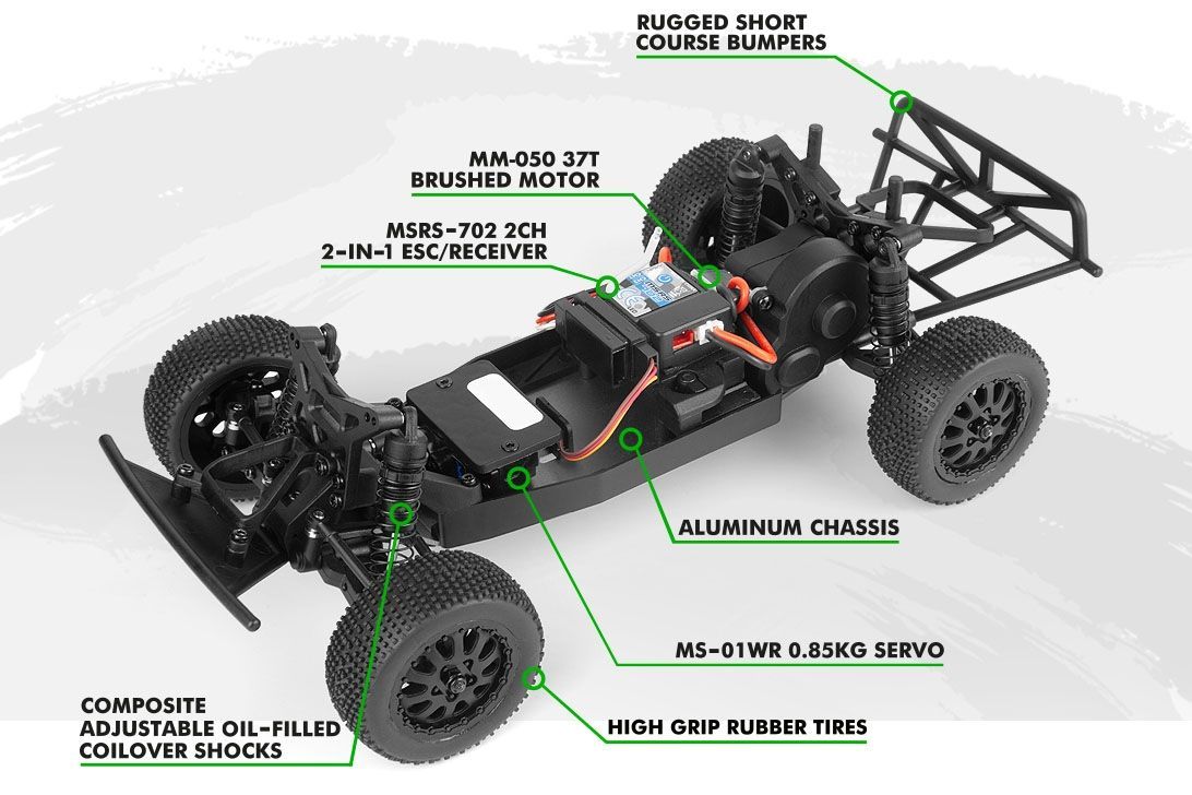 2-v-1 ESC/RX MSRS-702 a stejnosměrný motor MS-030 zajišťují jednoduchost a spolehlivost, zatímco rychle přístupný držák akumulátoru umožňuje rychlé a bezproblémové zastávky v boxech. Plně připraveno k jízdě s rádiem MTX-702, 7,4V 350mAh LiPo a USB nabíječem v balení od prvního závodu vás dělí jen jedno nabití.