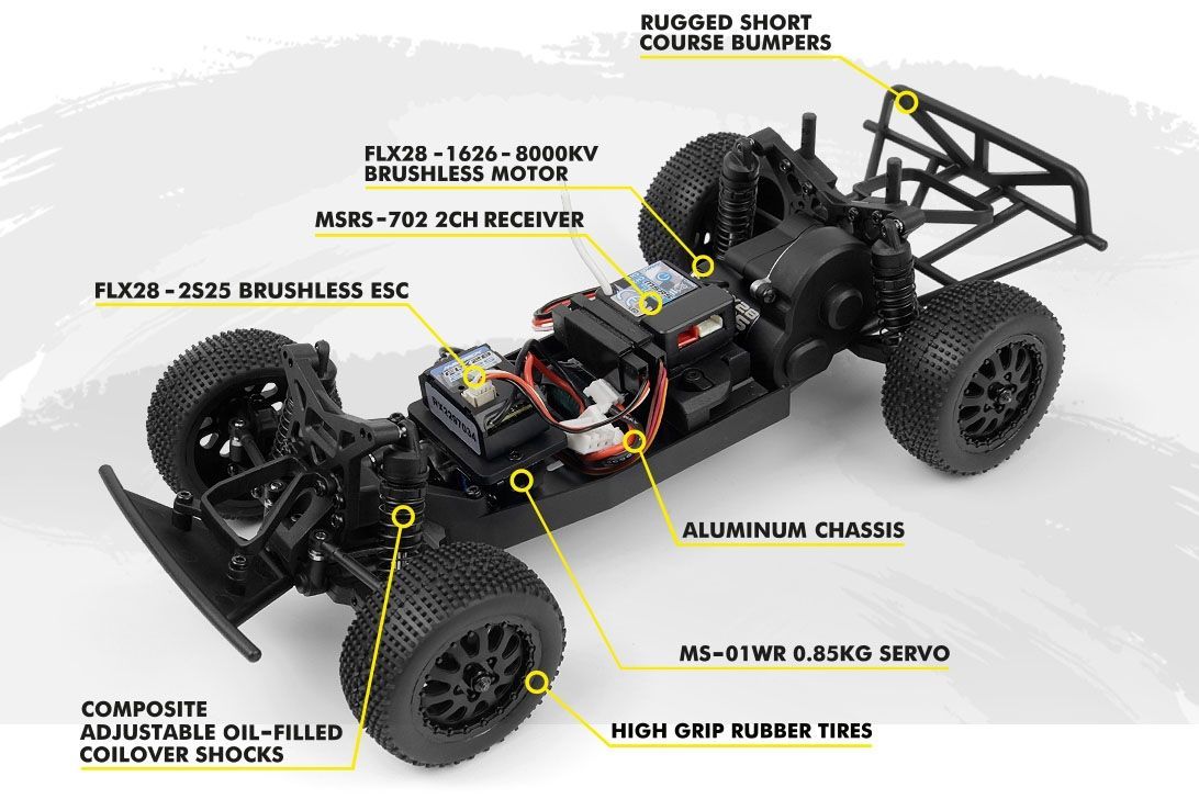 Stále se používá jednotka 2-v-1 ESC/RX MSRS-702, ale pouze v režimu přijímače, a je doplněna o střídavé kombo FLX28 pro nezaměnitelný výkon a spolehlivost Flux, zatímco rychle přístupná přihrádka na akumulátor umožňuje rychlé a bezproblémové zastávky v boxech. Model je plně připravený k jízdě s vysílačem MTX-702, 7,4V 350mAh LiPo akumulátorem a USB nabíječem v balení od prvního závodu vás dělí jen jedno nabití.
