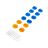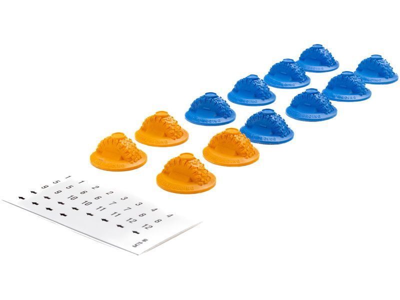 Balení obsahuje modré branky (8), oranžové branky (4), arch samolepek.
