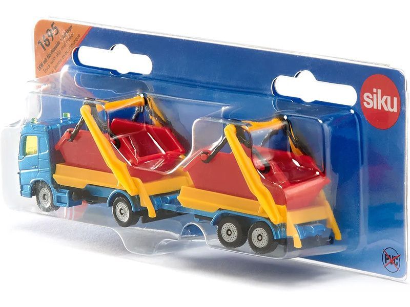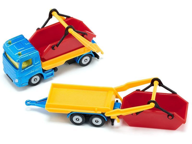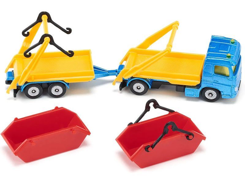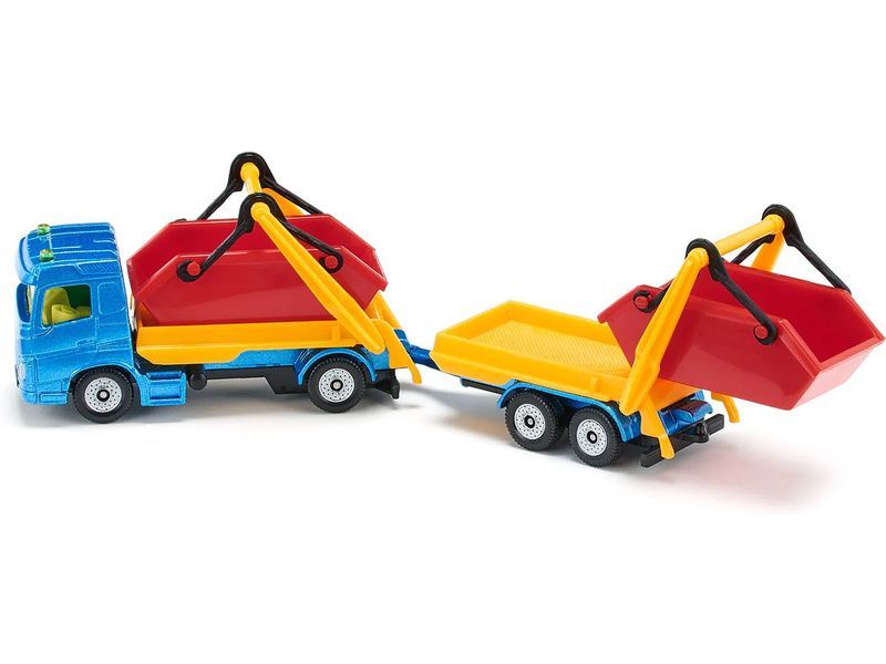 Kovový model nákladního auta s přívěsem a kontejnery, délka přibližně 15 cm. Model obsahuje čirá okna, majáčky, odpojitelný dvounápravový přívěs, sklopná ramena a dva červené kontejnery. Vhodné pro hraní i sběratelství. Kvalitní zpracování z kovu a plastu. Baleno v blistru.