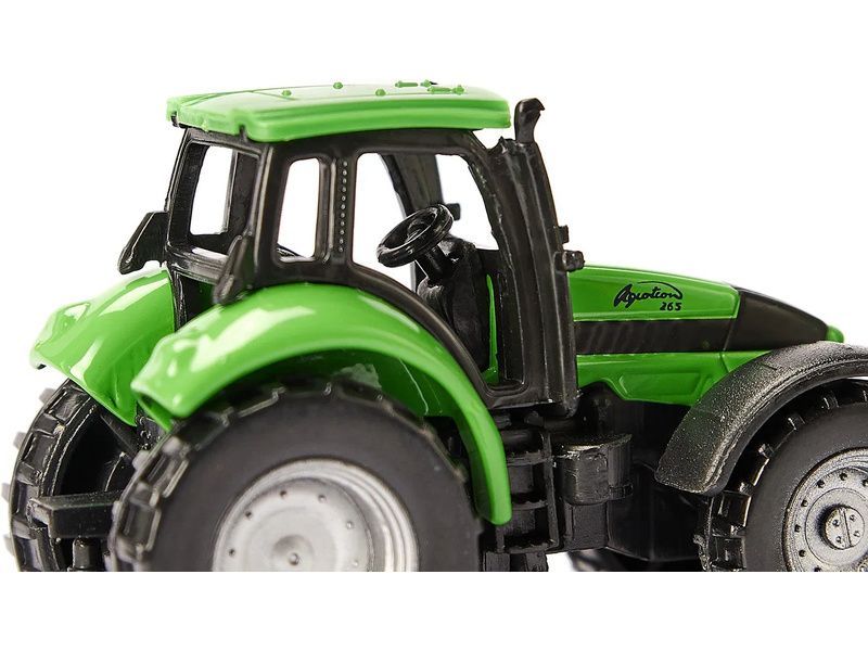 Kovový model traktoru DEUTZ-FAHR s vlečkou Fortuna, délka přibližně 17 cm. Traktor je vybaven tažným zařízením, odnímatelnou střechou a gumovými pneumatikami. Vlečka je odpojitelná, má otočnou přední nápravu, vyklápěcí krobu do strany a otevírací boční čelo. Vhodné pro hraní i sběratelství. Kvalitní zpracování z kovu a plastu. Baleno v blistru.