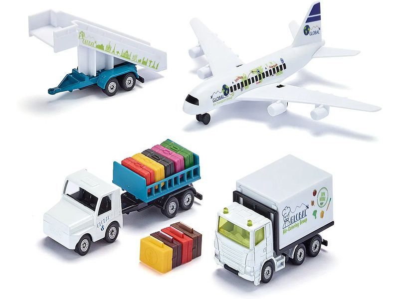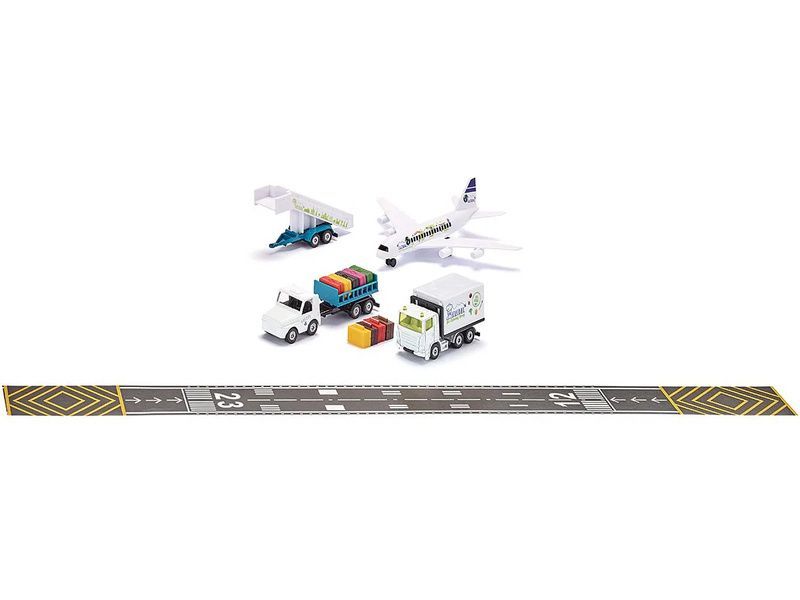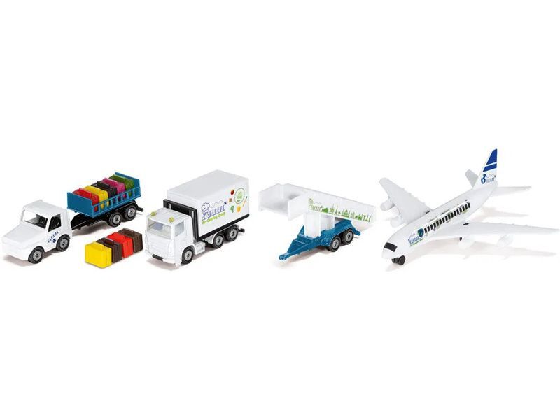 Sada kovový modelů - letištní odbavovací set od značky Siku. Sada obsahuje letadlo s koly, cateringový vůz s nůžkovým zdvižným mechanismem korby, letištní vozidlo, za které lze připojit přívěs s otevíracími kufry nebo přívěs se schody. Součástí je páska s motivem dráhy o délce 5 m. Vhodné pro hraní i sběratelství. Kvalitní zpracování z kovu a plastu.