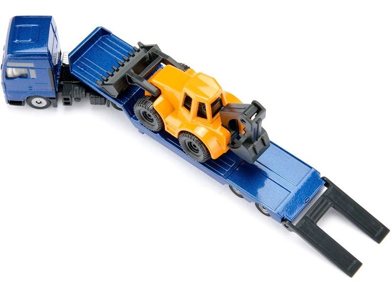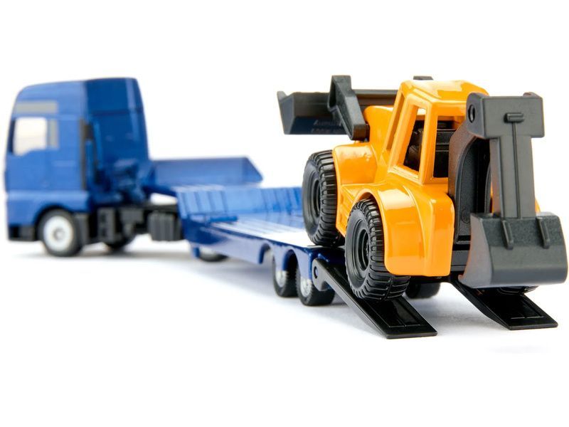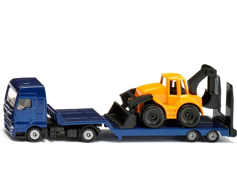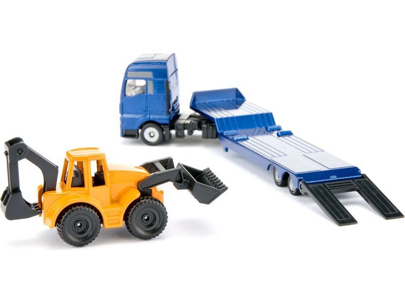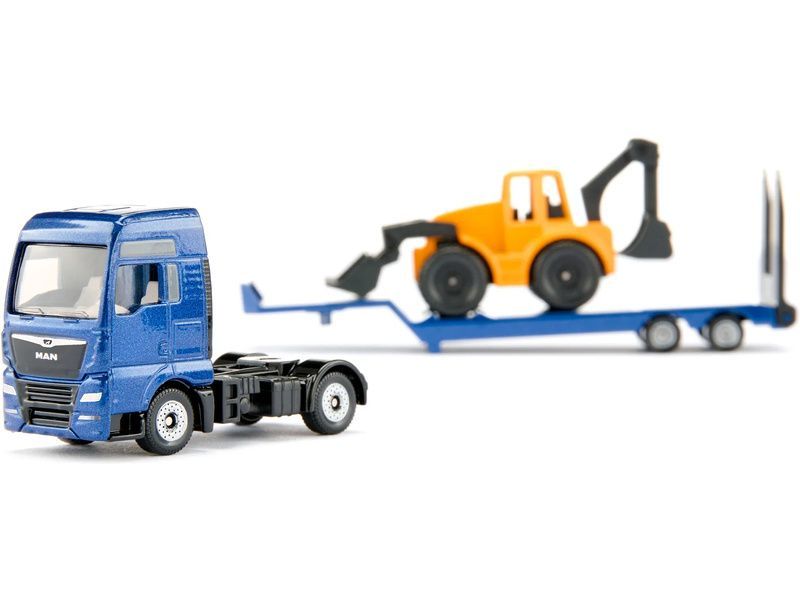 Kovový model tahače MAN s návěsem a rypadlem v měřítku 1:87 od značky Siku. Tahač s čirými okny a zpracovaným interiérem, včetně odpojitelného dvounápravového návěsu se sklopnými nájezdy. Model rypadla má pohyblivý přední nakladač i zadní rypadlo. Vhodné pro hraní i sběratelství. Kvalitní zpracování z kovu a plastu.
