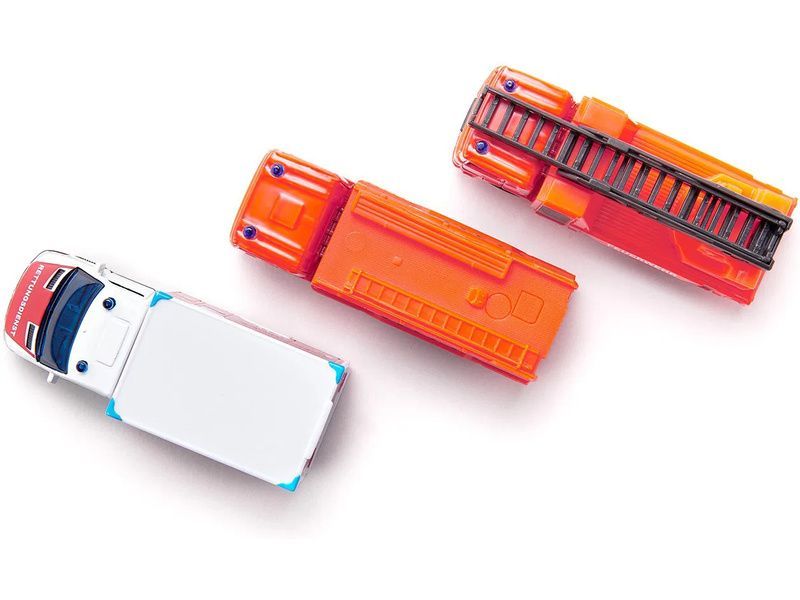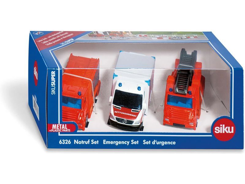 Sada kovový modelů - záchranářská vozidla od značky Siku. Sada obsahuje hasičské auto s otočným výsuvným žebříkem, hasičský kamion a vozidlo ambulance. Modely mají čirá okna, zpracovaný interiér a majáčky. Vhodné pro hraní i sběratelství. Kvalitní zpracování z kovu a plastu.