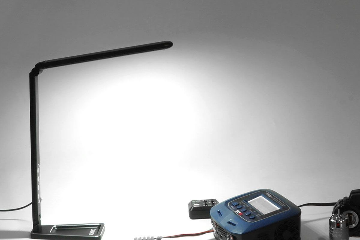 Skládací LED lampička se svítivostí 100W žárovky pro práci v depu s odkládacím prostorem na šroubky. Tři barevné teploty a šest úrovní intenzity světla přepínané tlačítky. Napájení 6-15V (příkon max. 11W) nebo USB-C 5 V/2,1A. Napájecí kabel se 4 mm banánky a USB-C. Včetně textilního pouzdra.