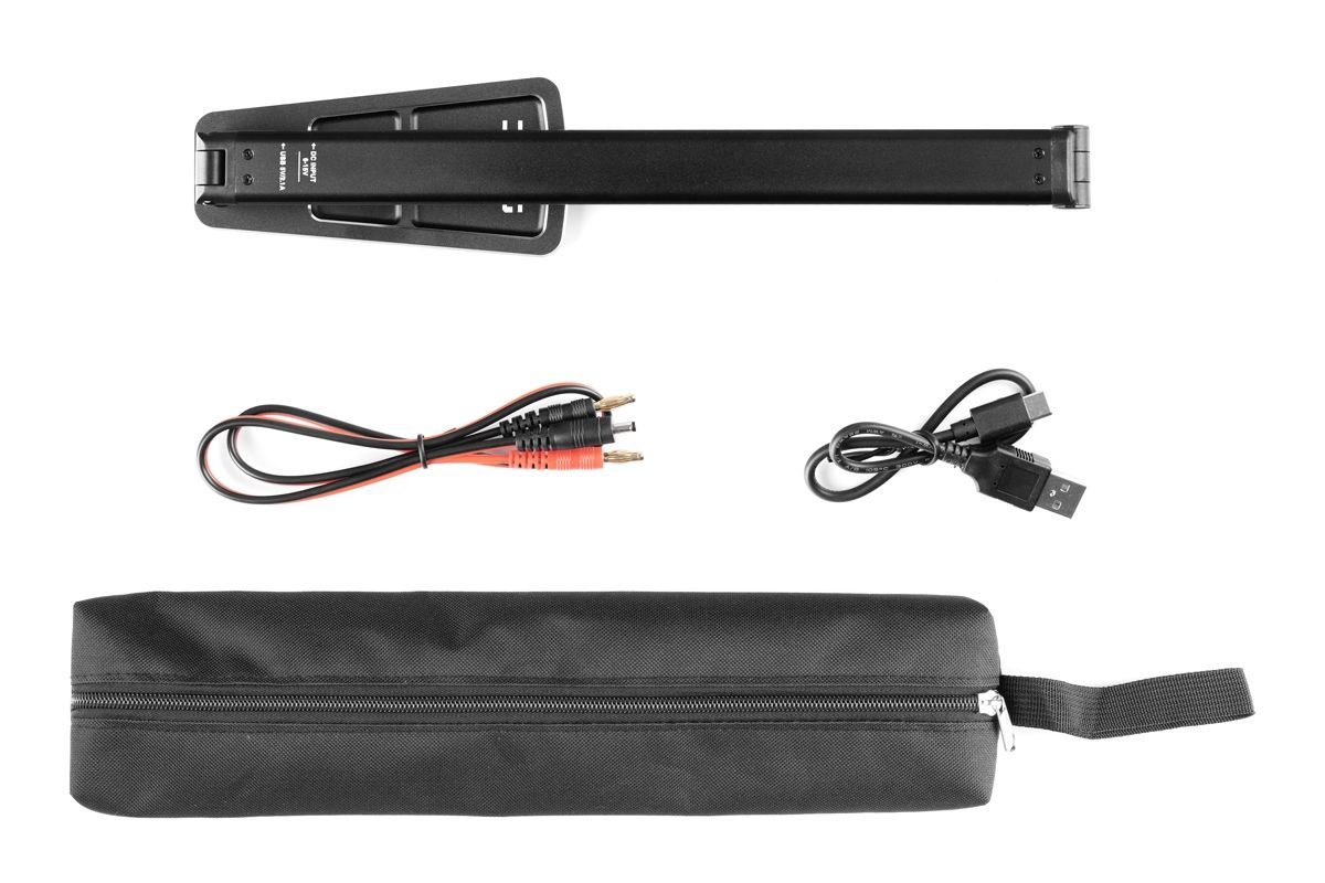 Sada lampičky obsahuje: Sklopnou LED lampičku, napájecí kabel se 4 mm banánky, napájecí USB-C kabel, plátěné pouzdro na lampičku, návod.
