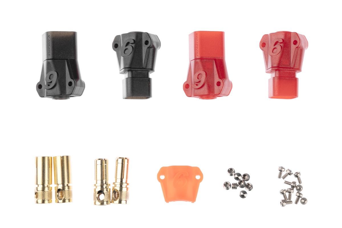 Zlacené 6mm konektory s domkem pro 8,4mm2 (8AWG) kabel. Konstantní proud 240A, špičkový 280A. Max 60V DC. Nepájecí varianta - kabel je zajištěn pomocí dvou imbusových červíků. Balení 2 páry. Kompatibilní s Anti-spark S6 6808 ASST (REB6808ASSTS6P2).