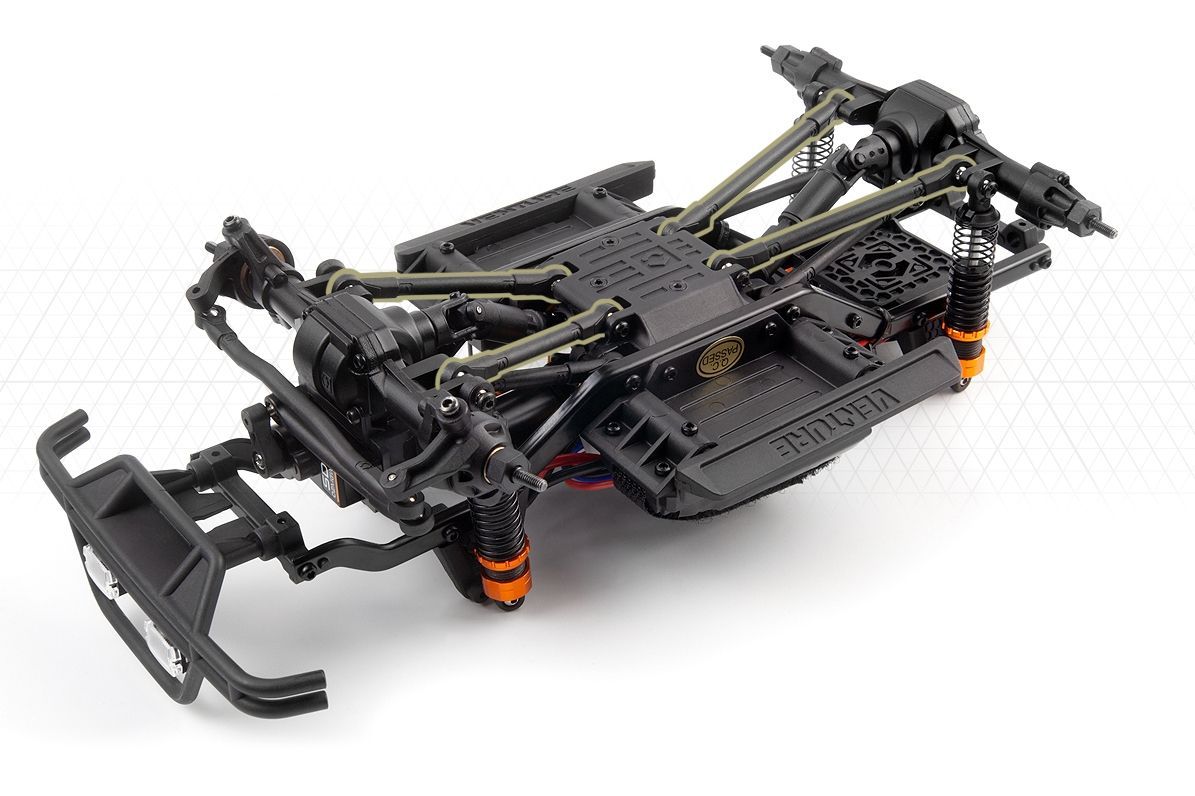 Stejně jako jeho větší bratr kombinuje Venture18 odolný podvozek z tvarovaných ocelových žebřin s realistickým odpružením a hnacím ústrojím. I přes své kompaktní rozměry je tento vůz nabitý působivými funkcemi, včetně nové celokovové dvoustupňové převodovky, čtyřprvkového předního a zadního zavěšení a univerzálních teleskopických protiběžných hnacích hřídelí. Díky autenticky odstupňovaným olejovým tlumičům a plně uzamčeným diferenciálům nabízí Venture18 spolehlivé jízdní vlastnosti ve všech terénních podmínkách.